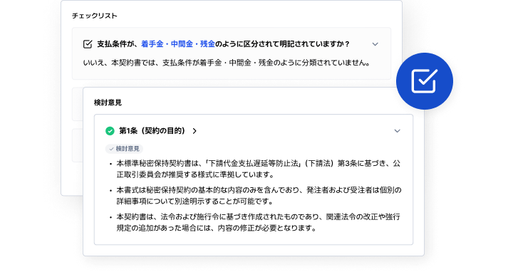 AIが契約書の重要事項や漏れ、リスク条項を識別します。